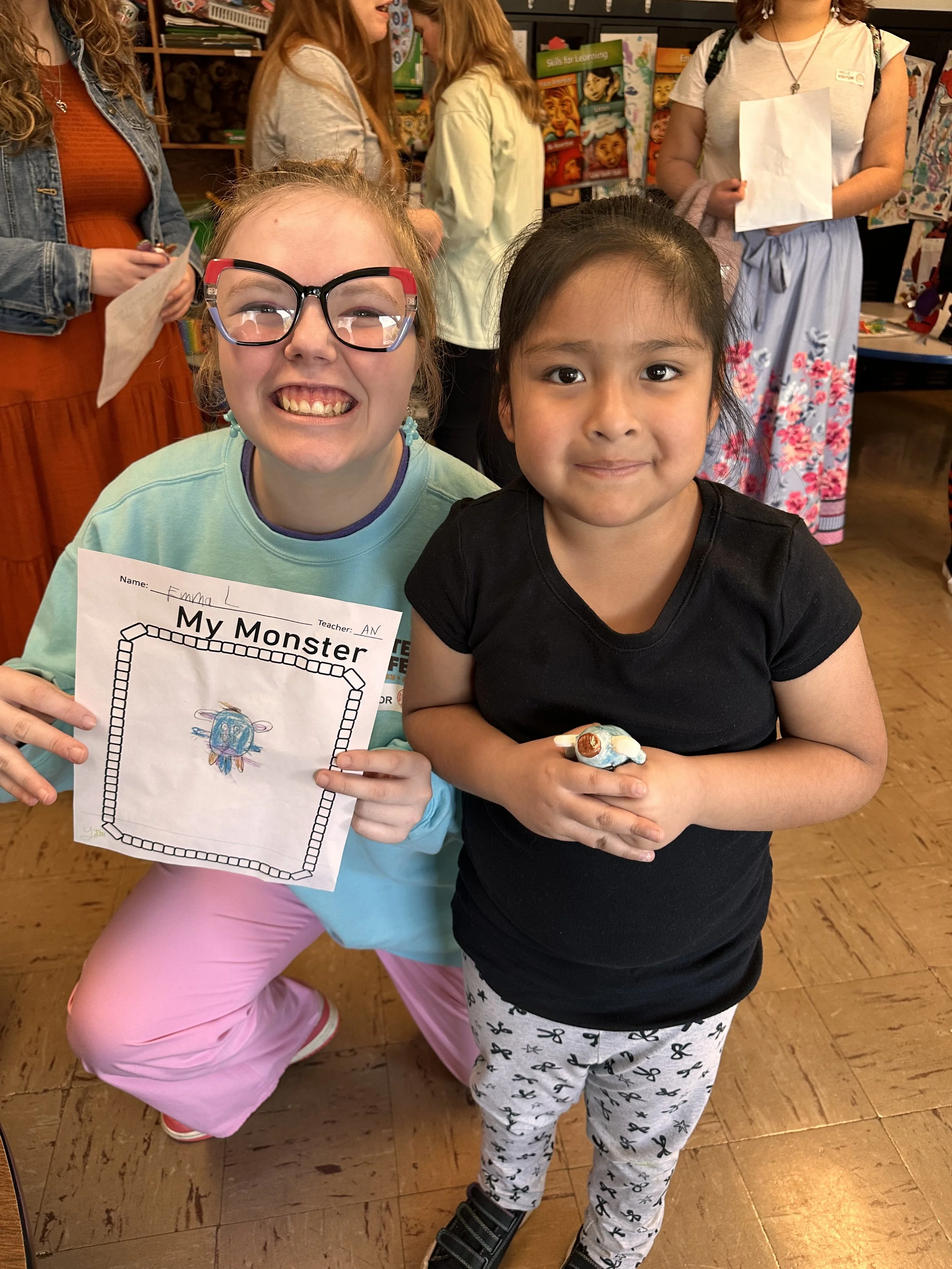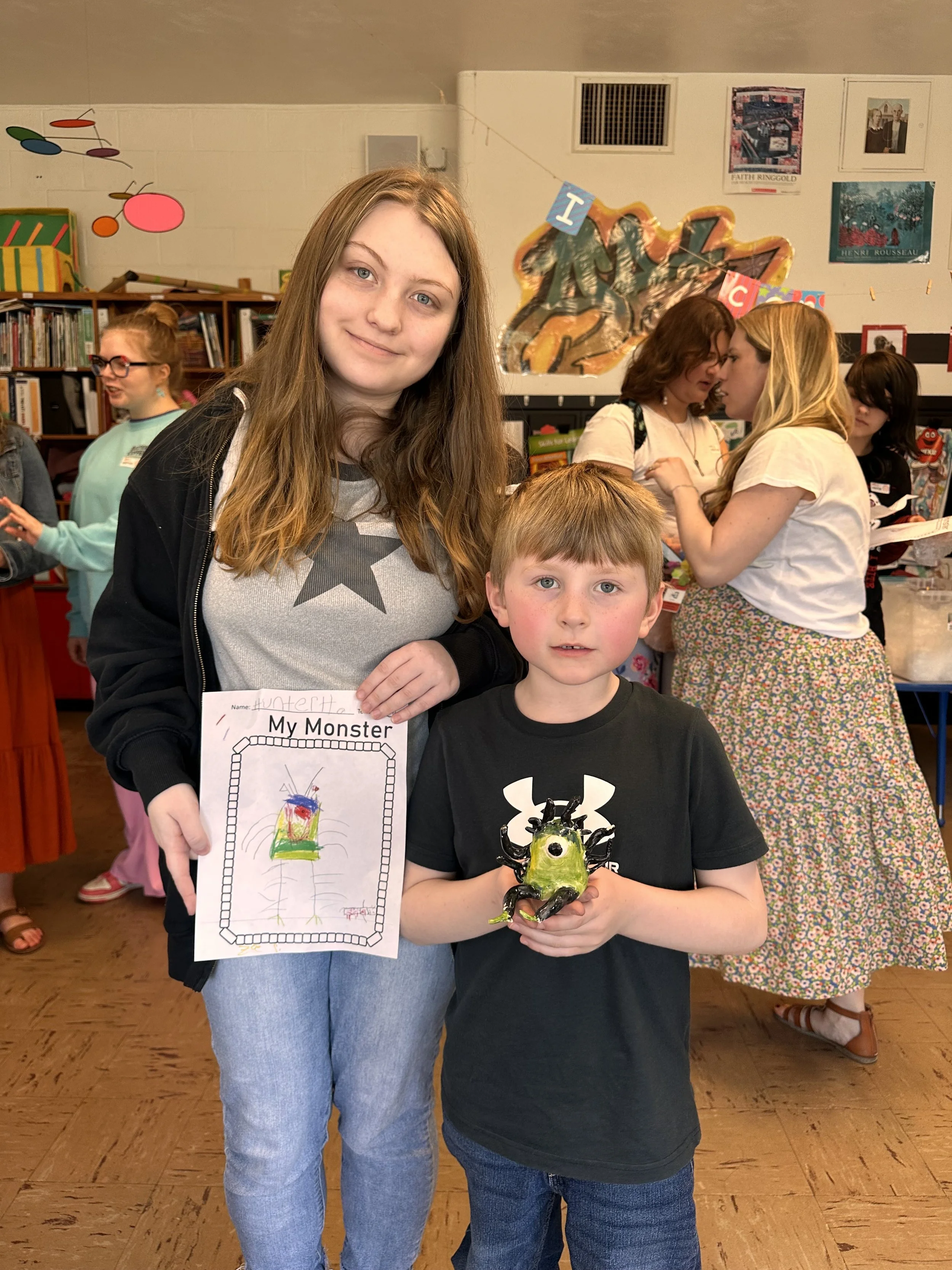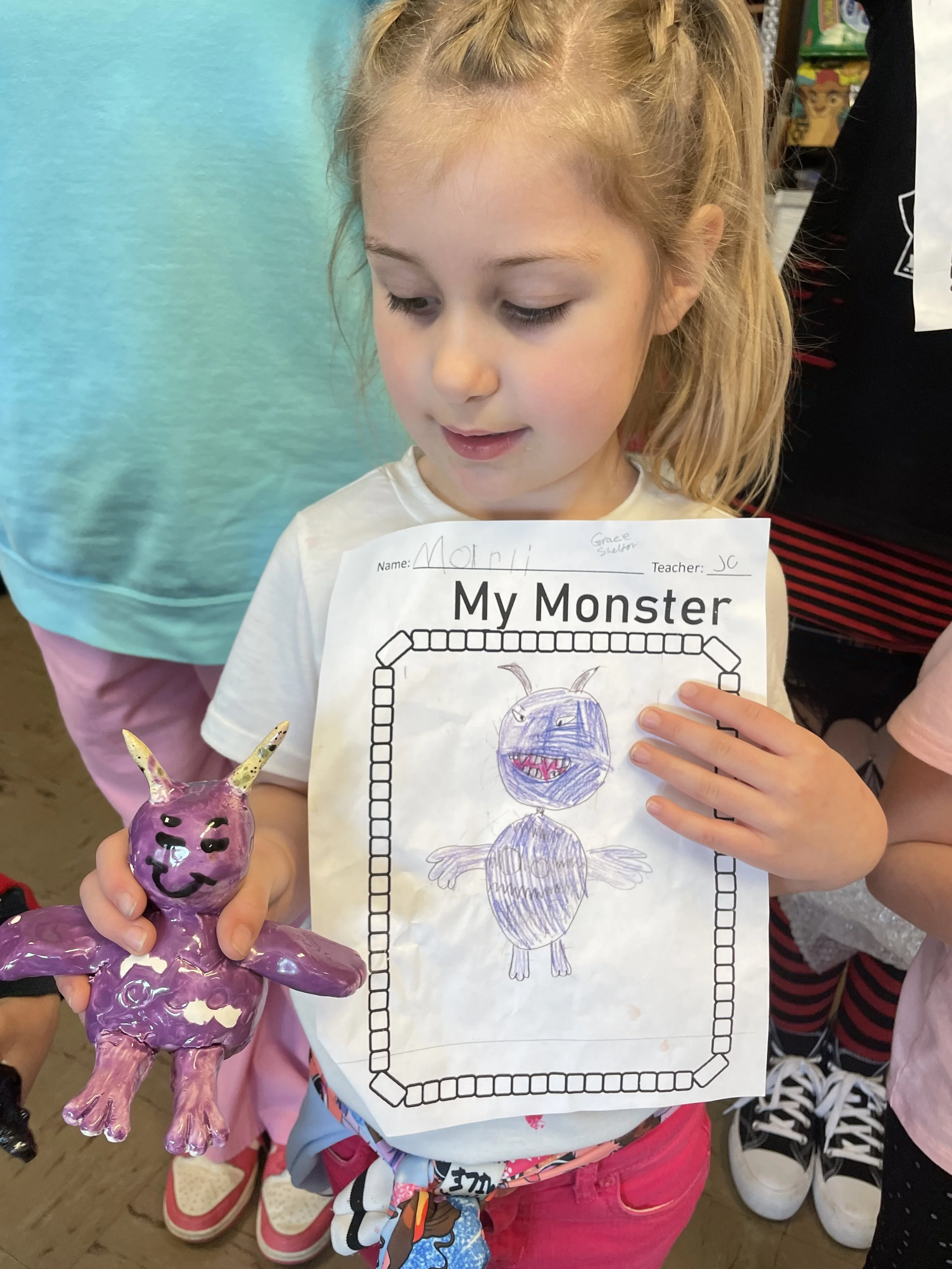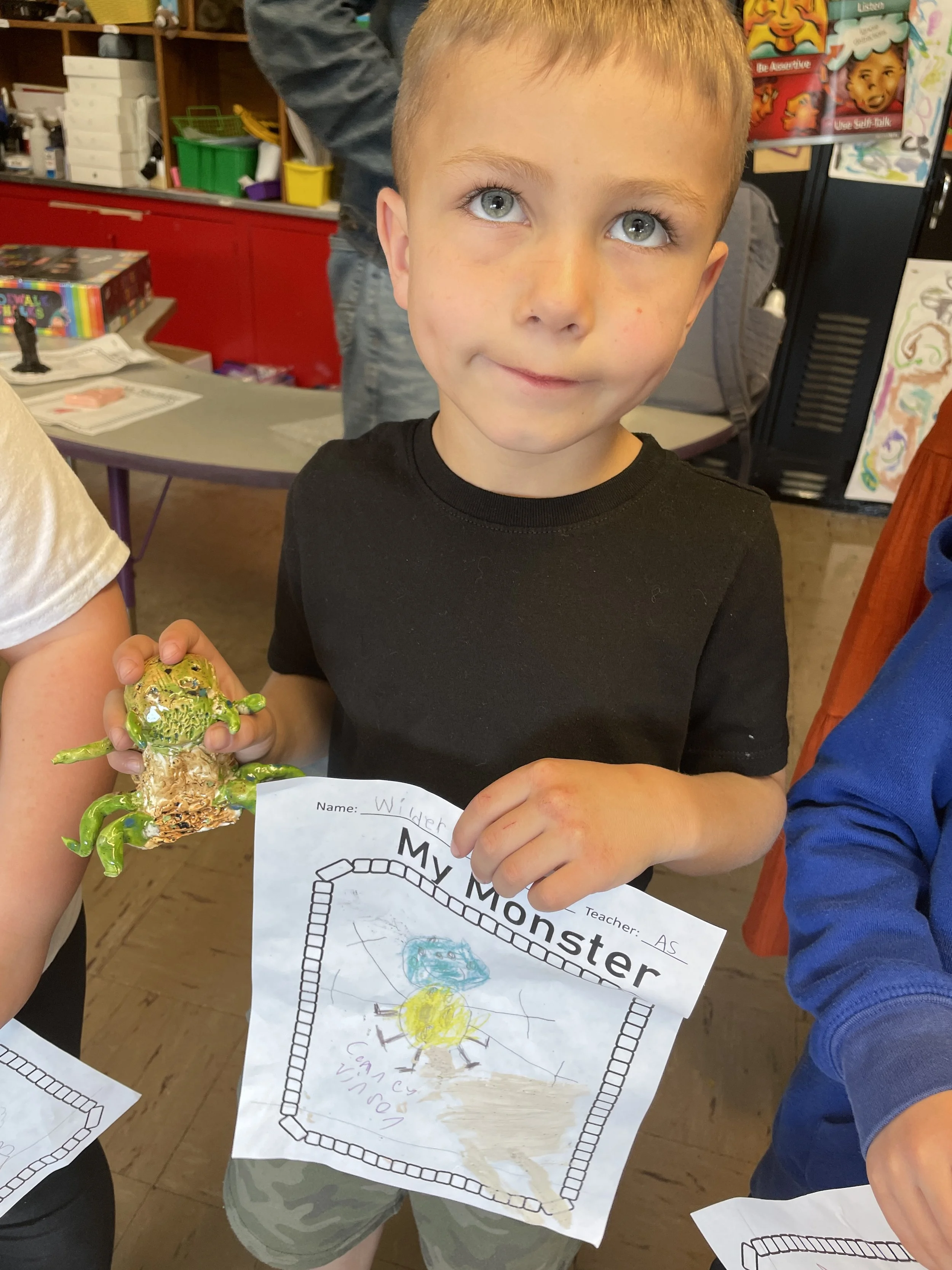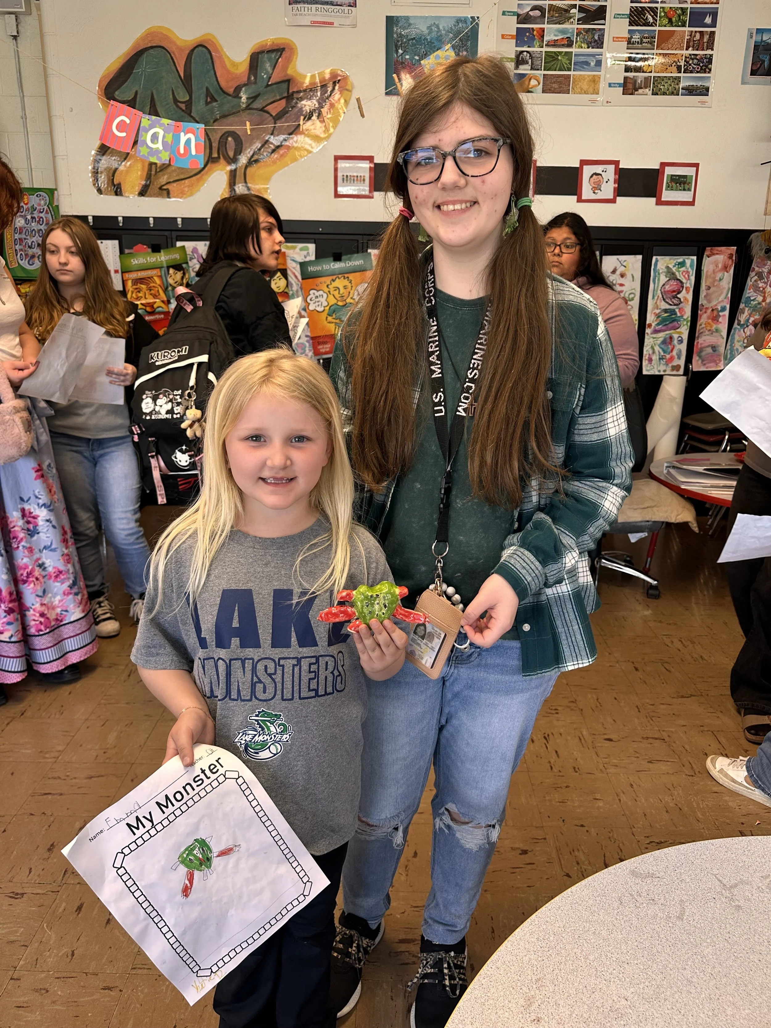 "Ceramic Monster Pals.” These were designed by Kindergarteners at Walker Early Learning Center and created with clay by the Junior Arts Council. Once Finished, the high schoolers gifted the Kindergarteners with their very own monsters that they designed previously.