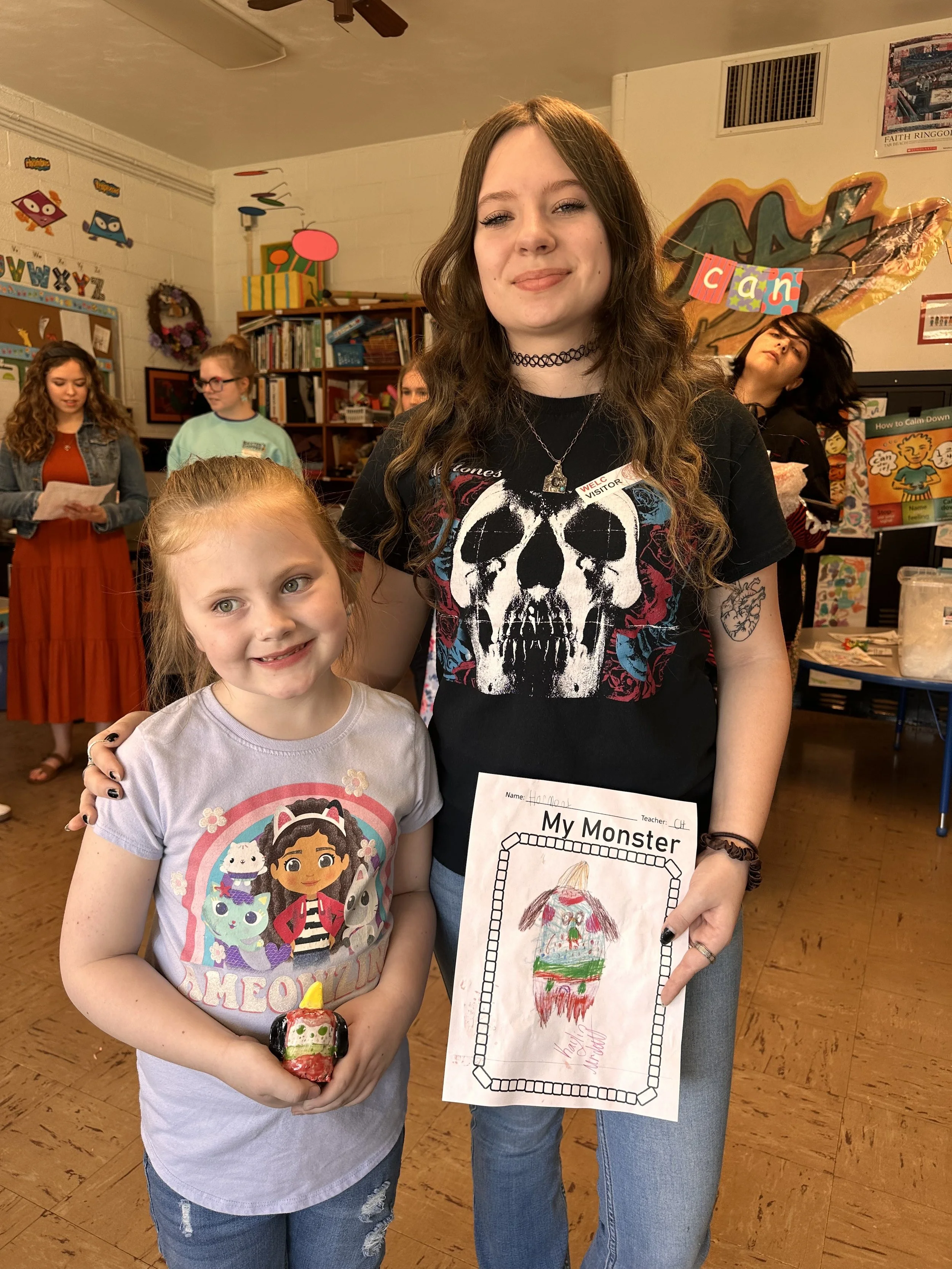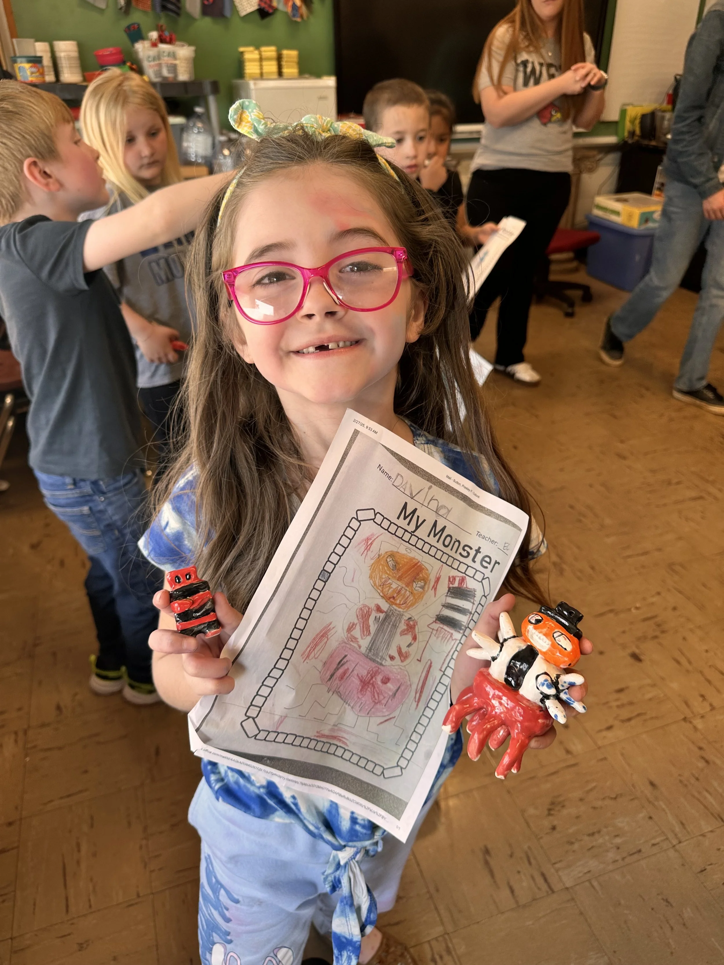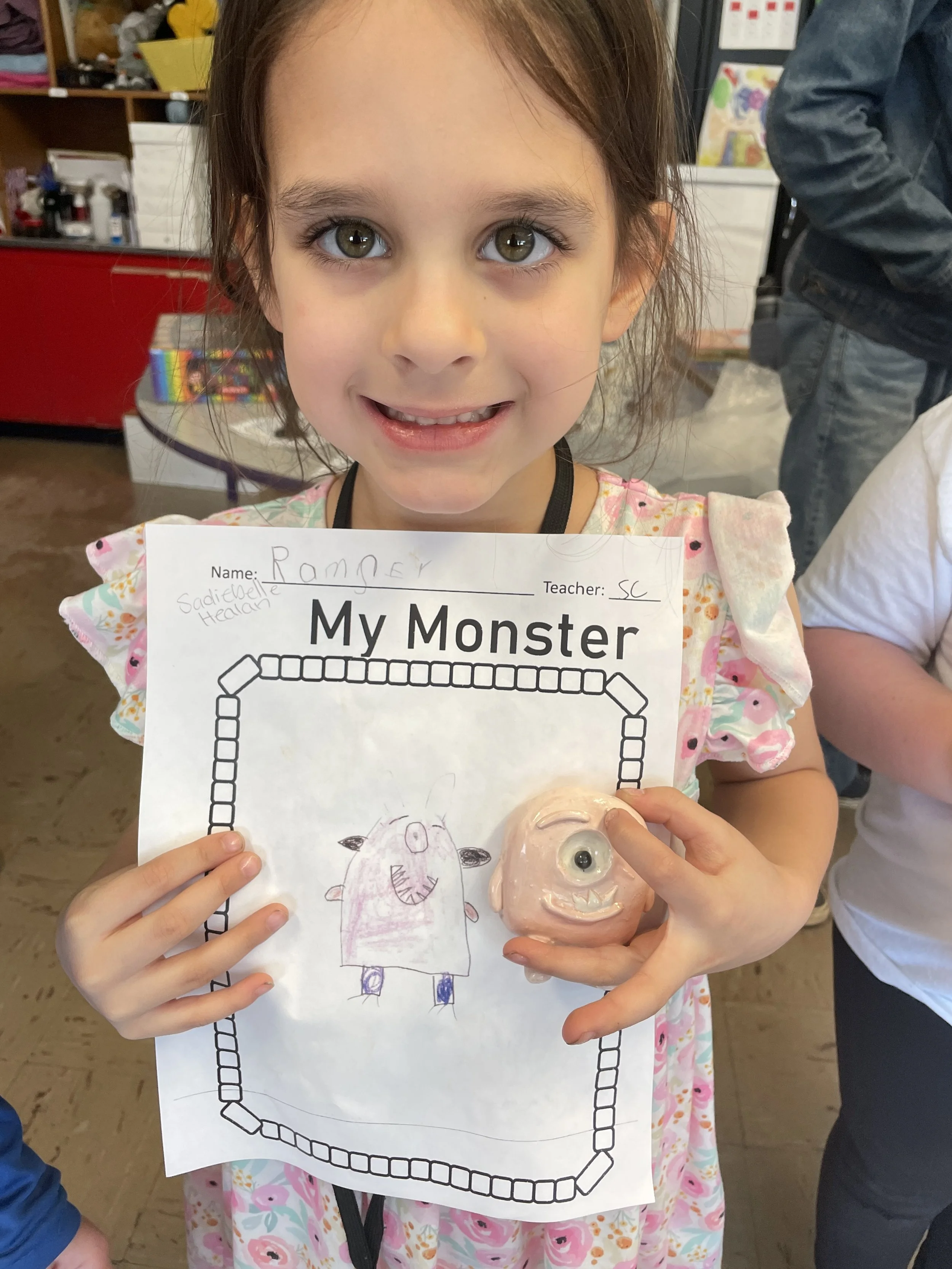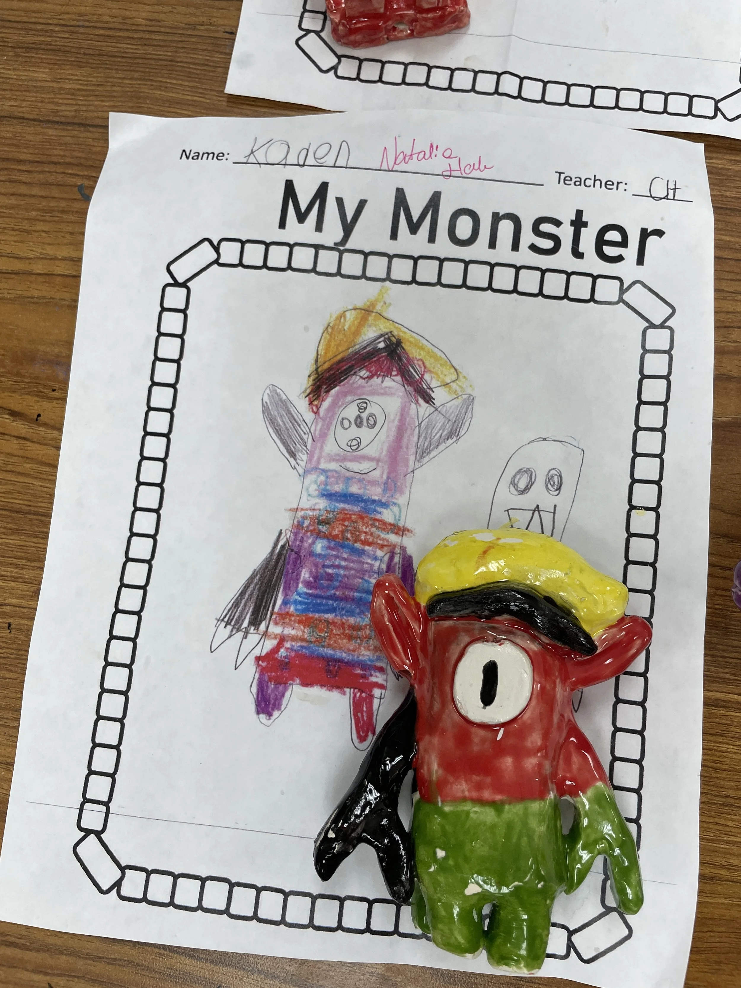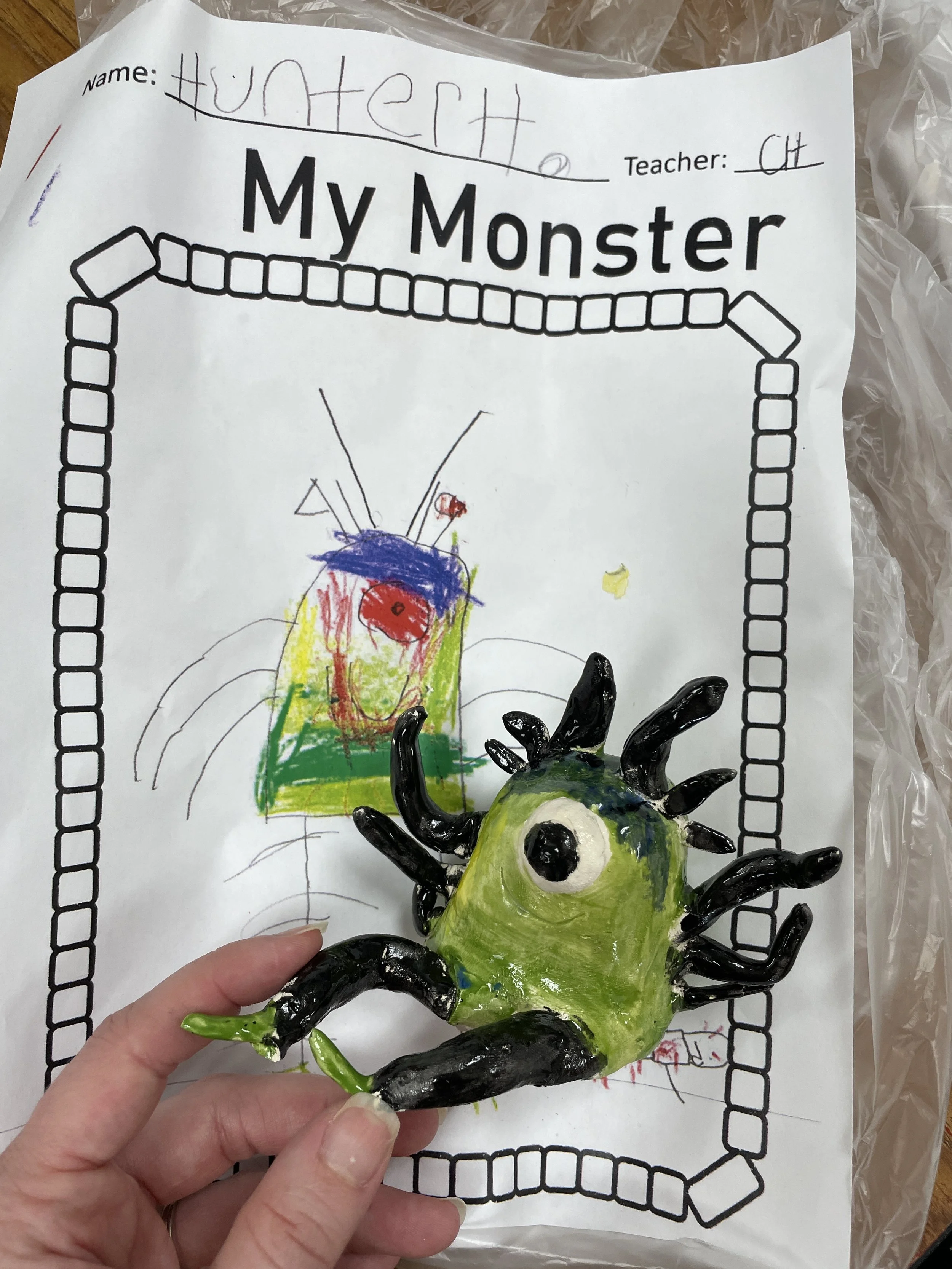 "Ceramic Monster Pals.” These were designed by Kindergarteners at Walker Early Learning Center and created with clay by the Junior Arts Council. Once Finished, the high schoolers gifted the Kindergarteners with their very own monsters that they designed previously.