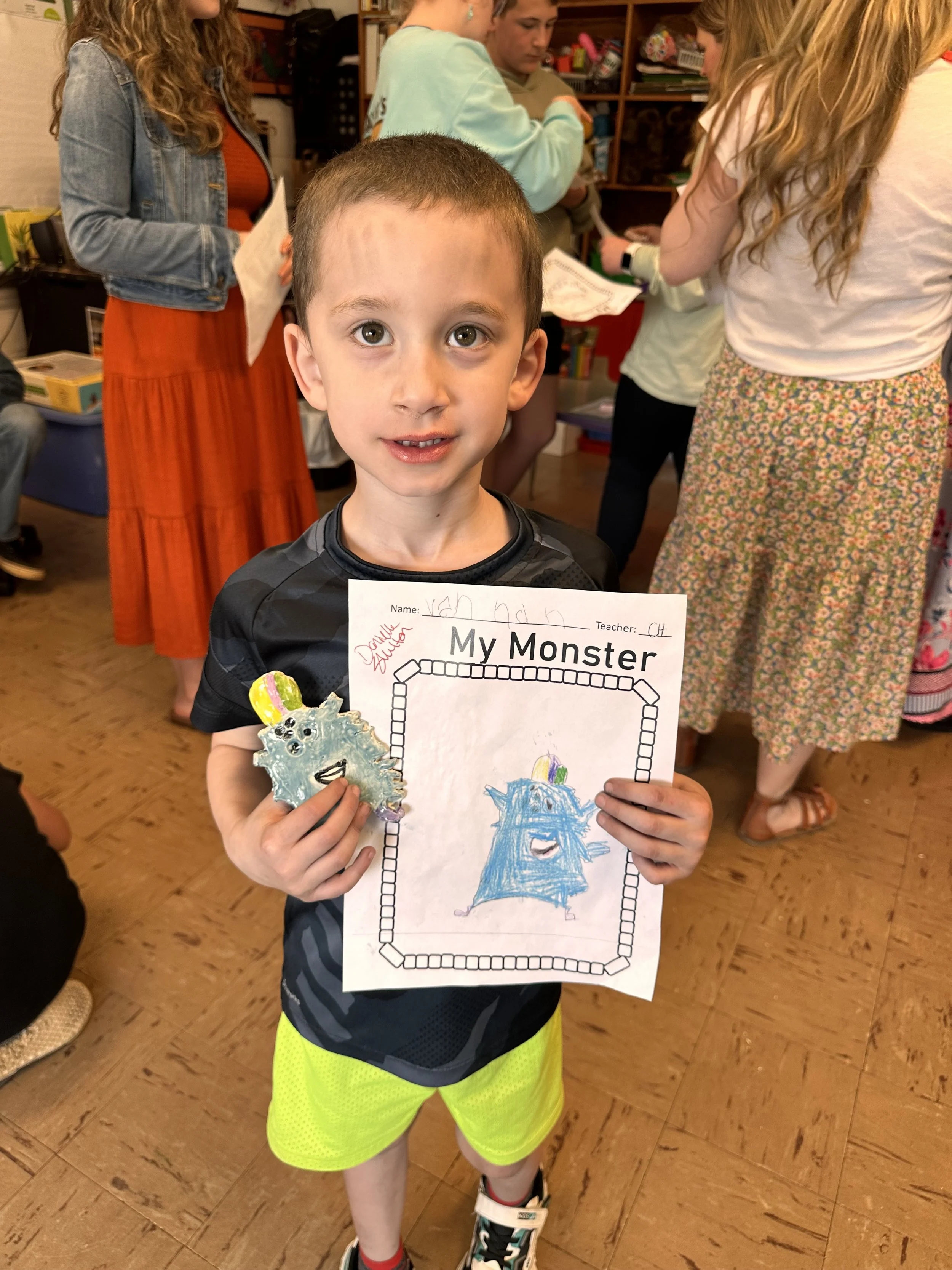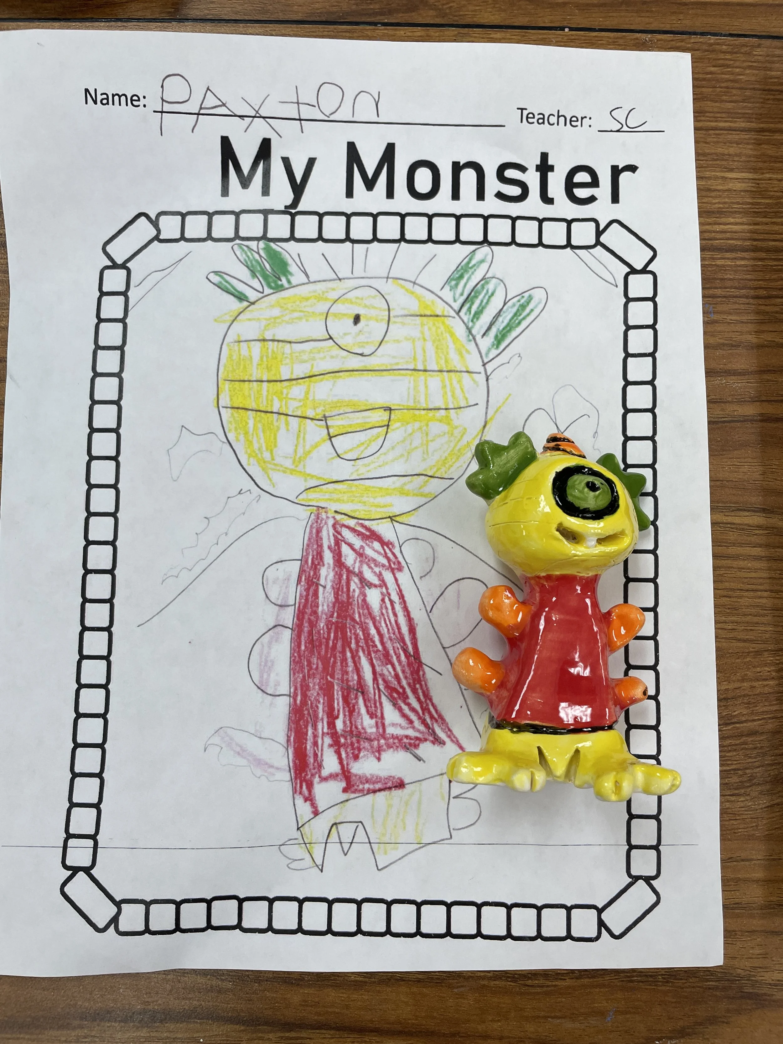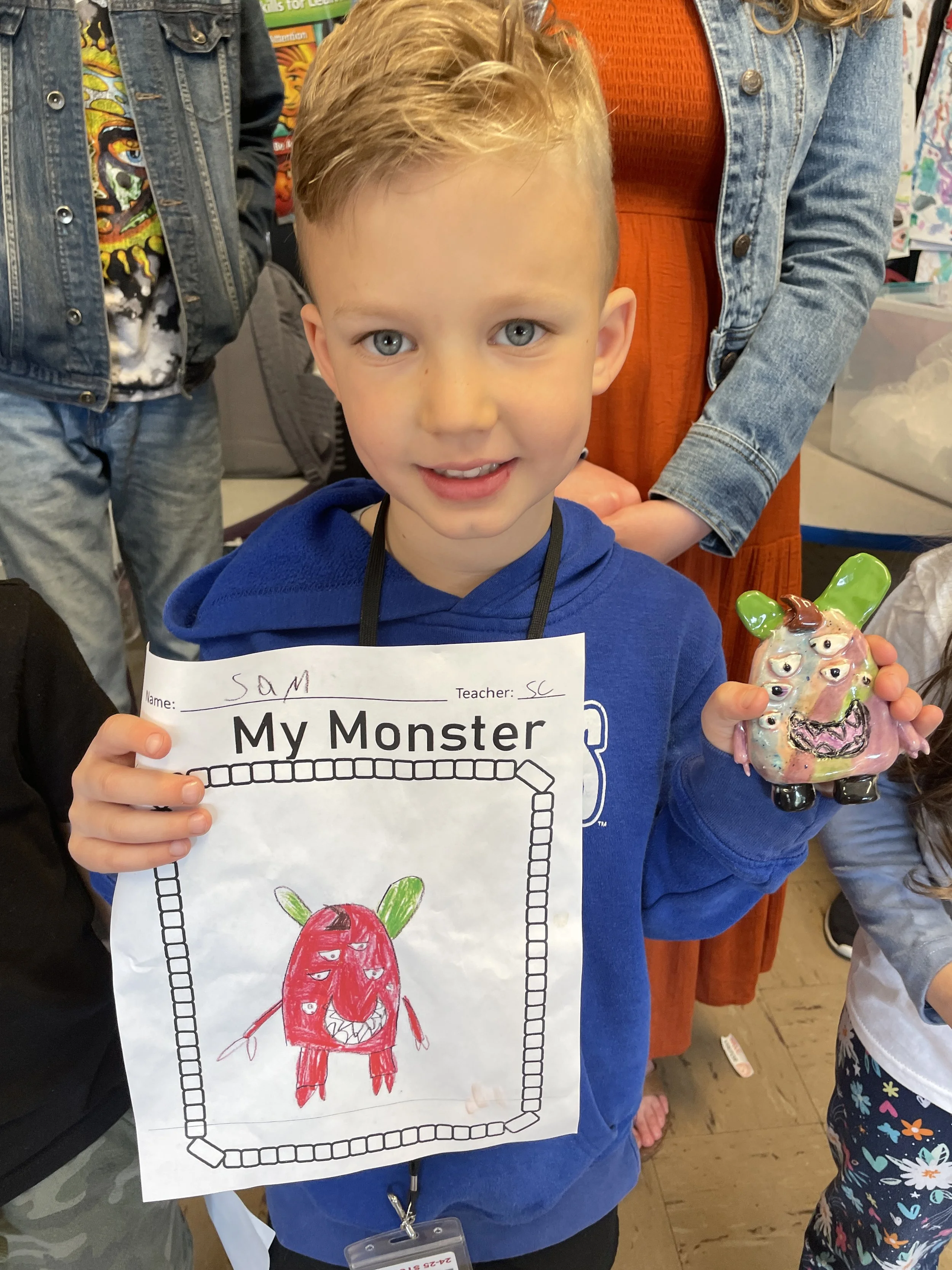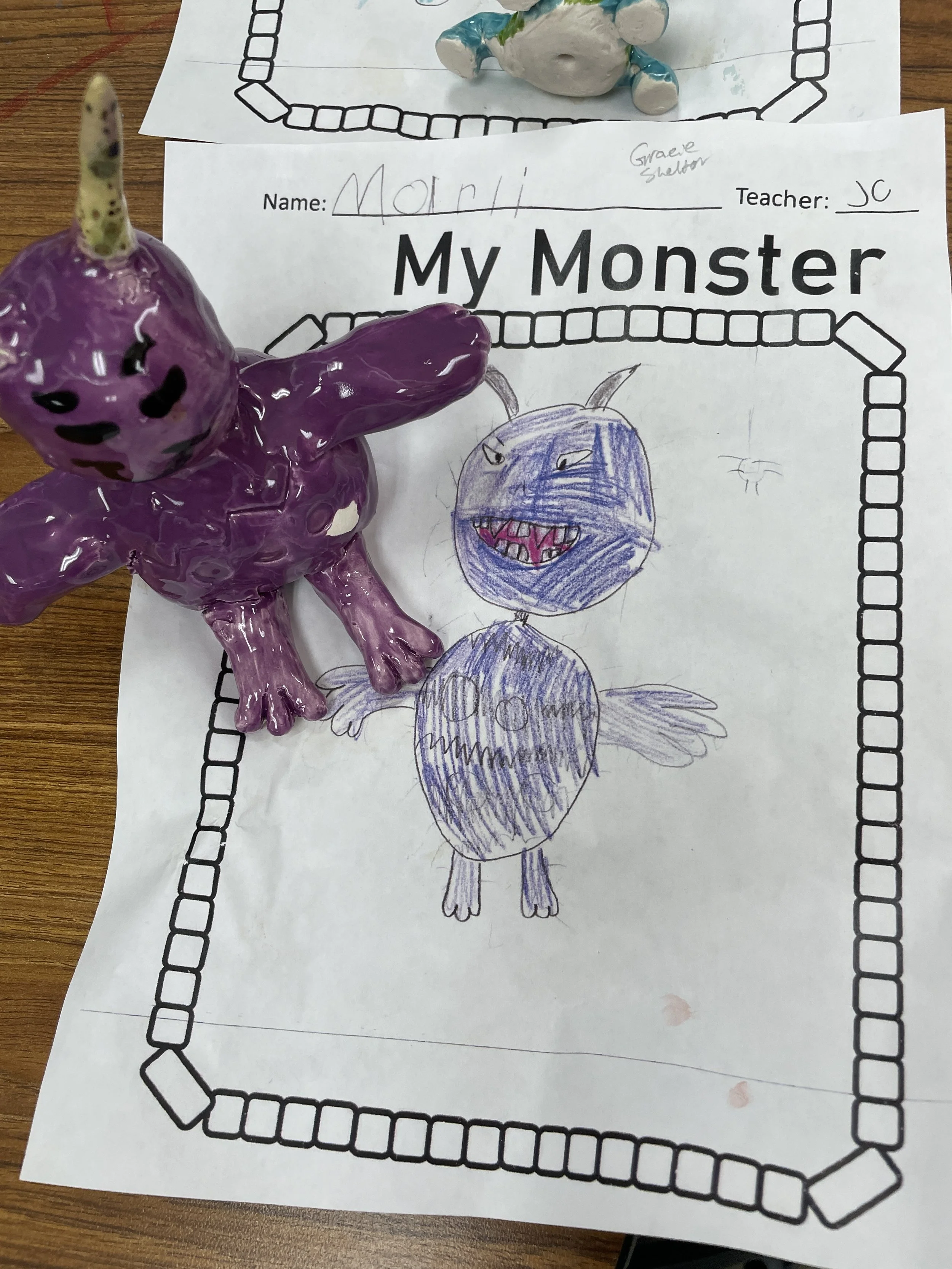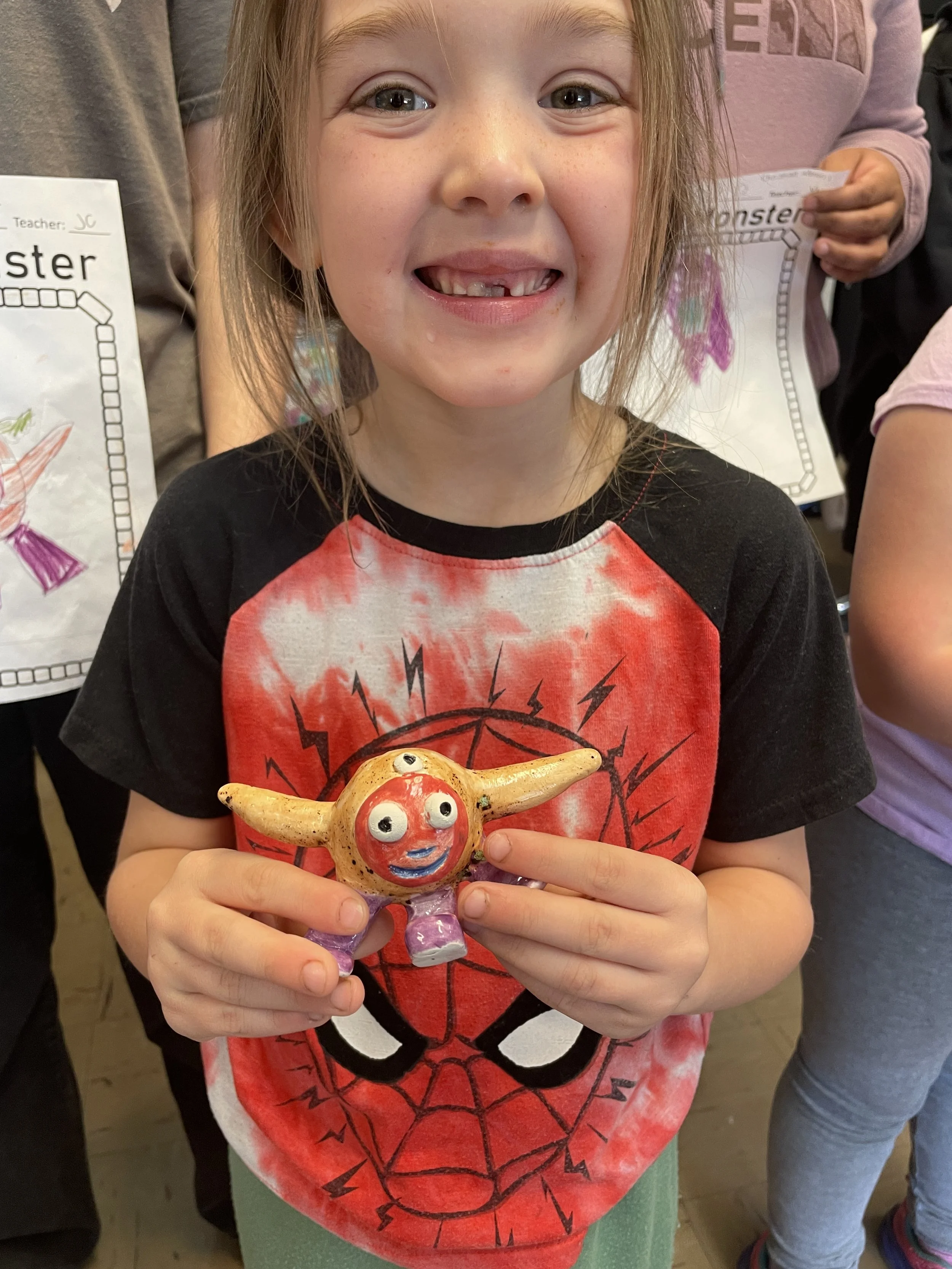 "Ceramic Monster Pals.” These were designed by Kindergarteners at Walker Early Learning Center and created with clay by the Junior Arts Council. Once Finished, the high schoolers gifted the Kindergarteners with their very own monsters that they designed previously.