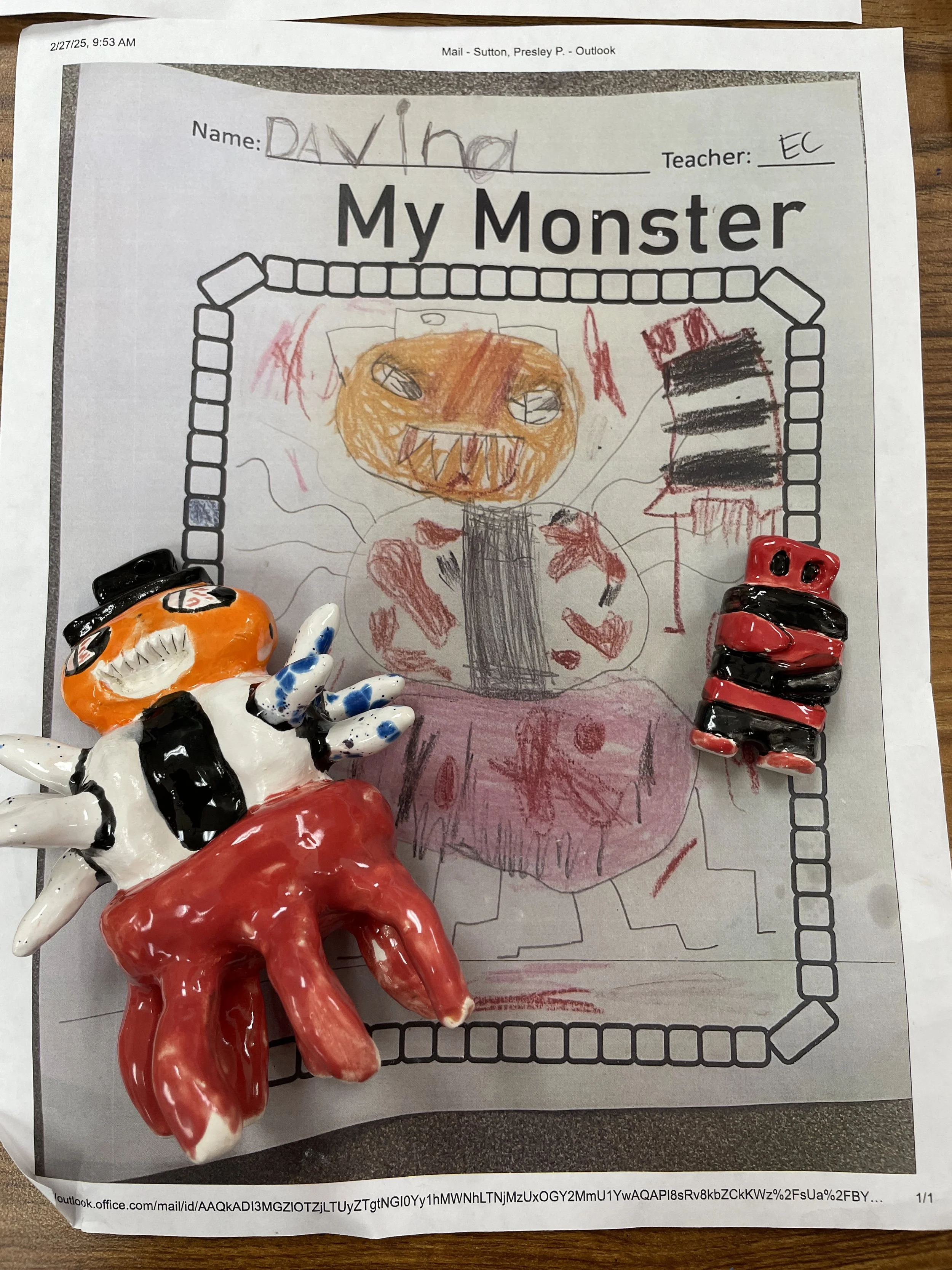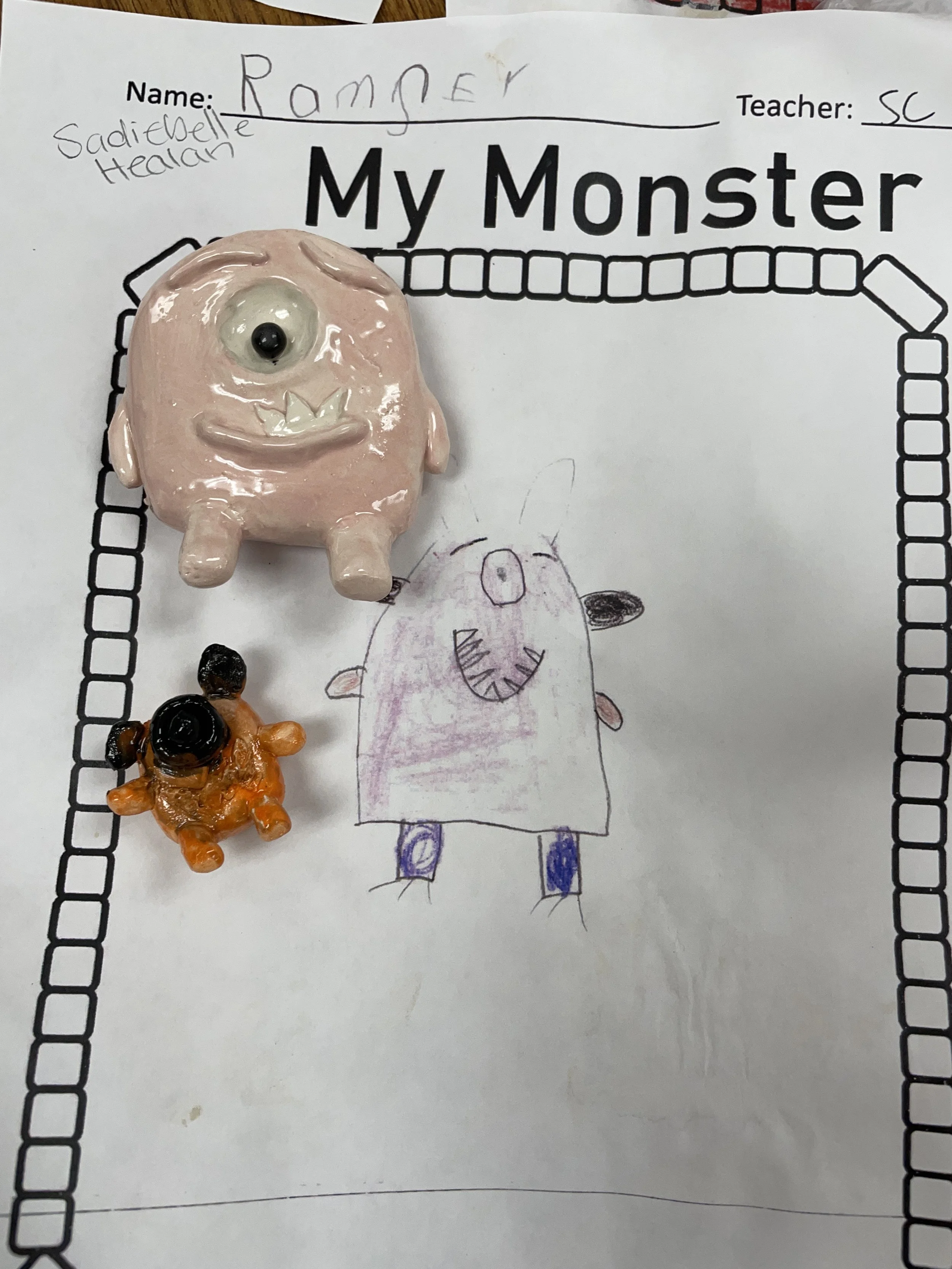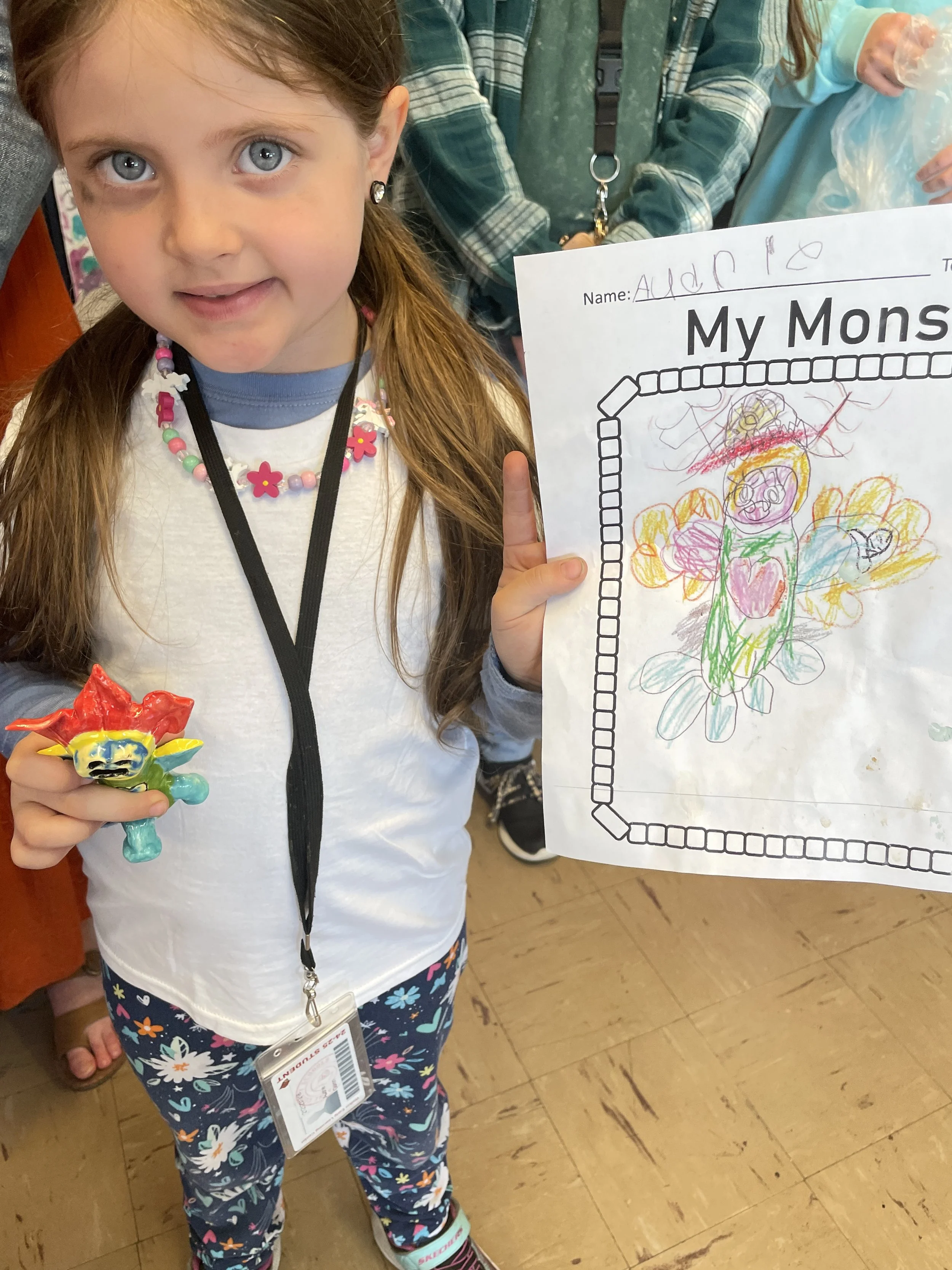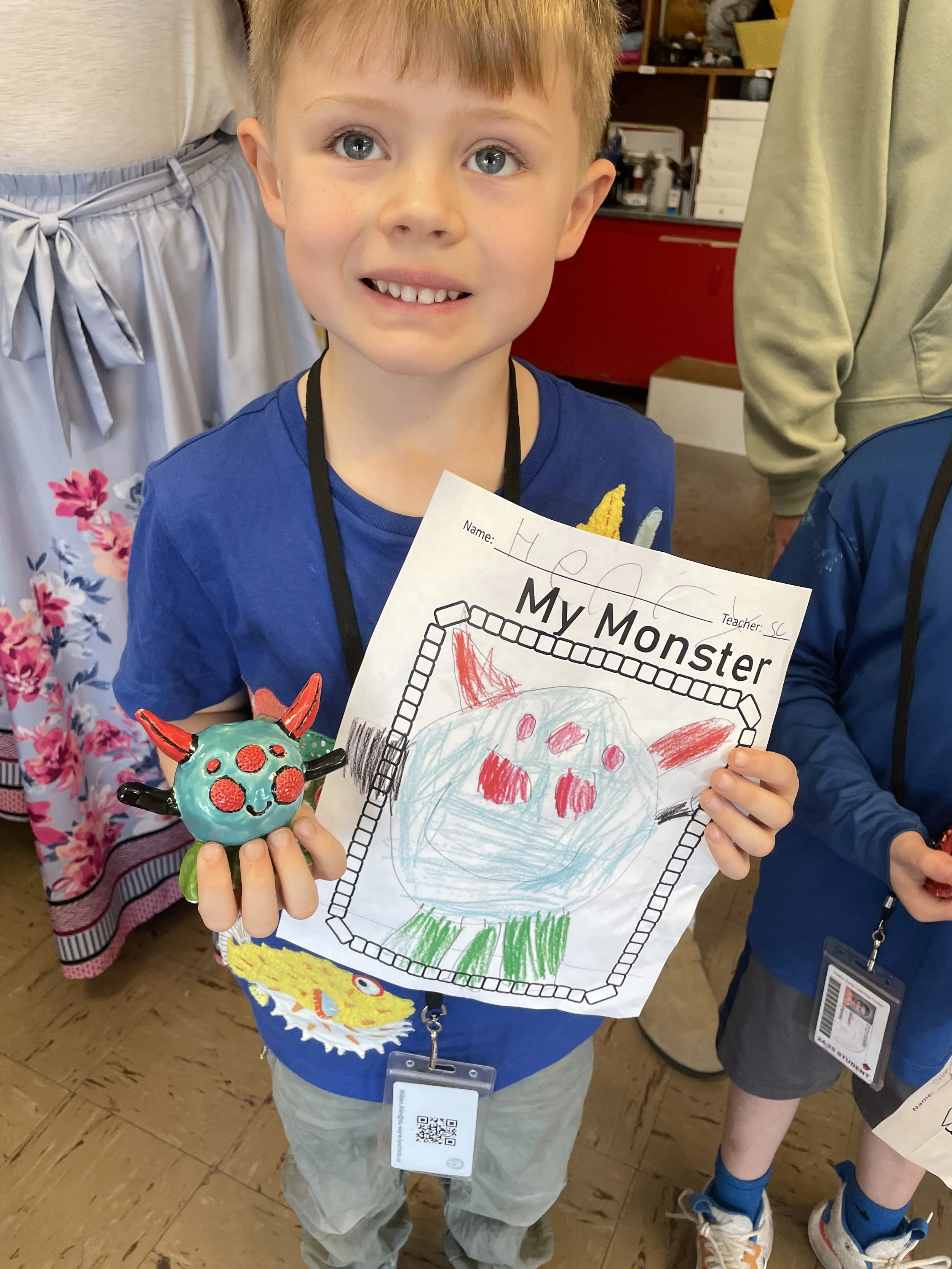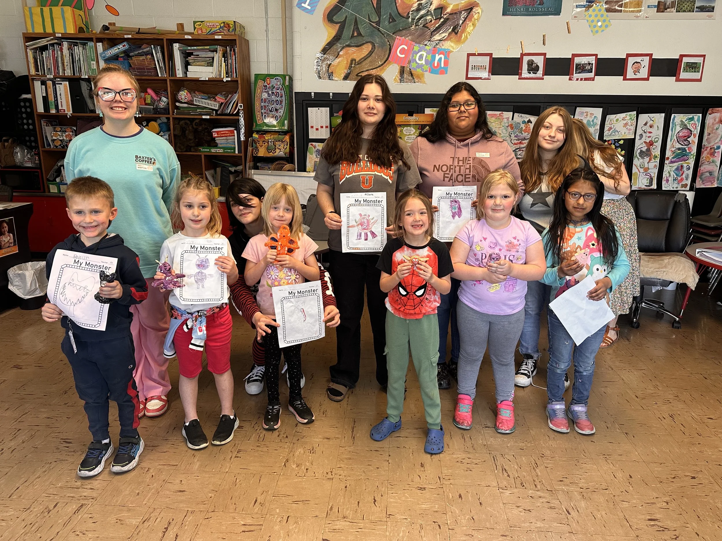 "Ceramic Monster Pals.” These were designed by Kindergarteners at Walker Early Learning Center and created with clay by the Junior Arts Council. Once Finished, the high schoolers gifted the Kindergarteners with their very own monsters that they designed previously.