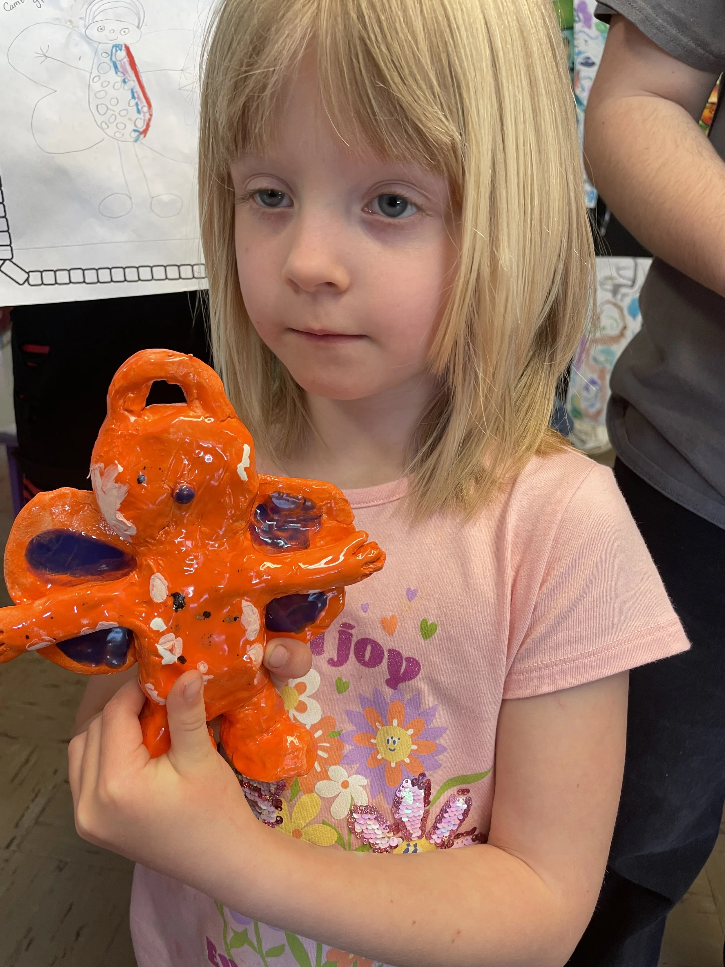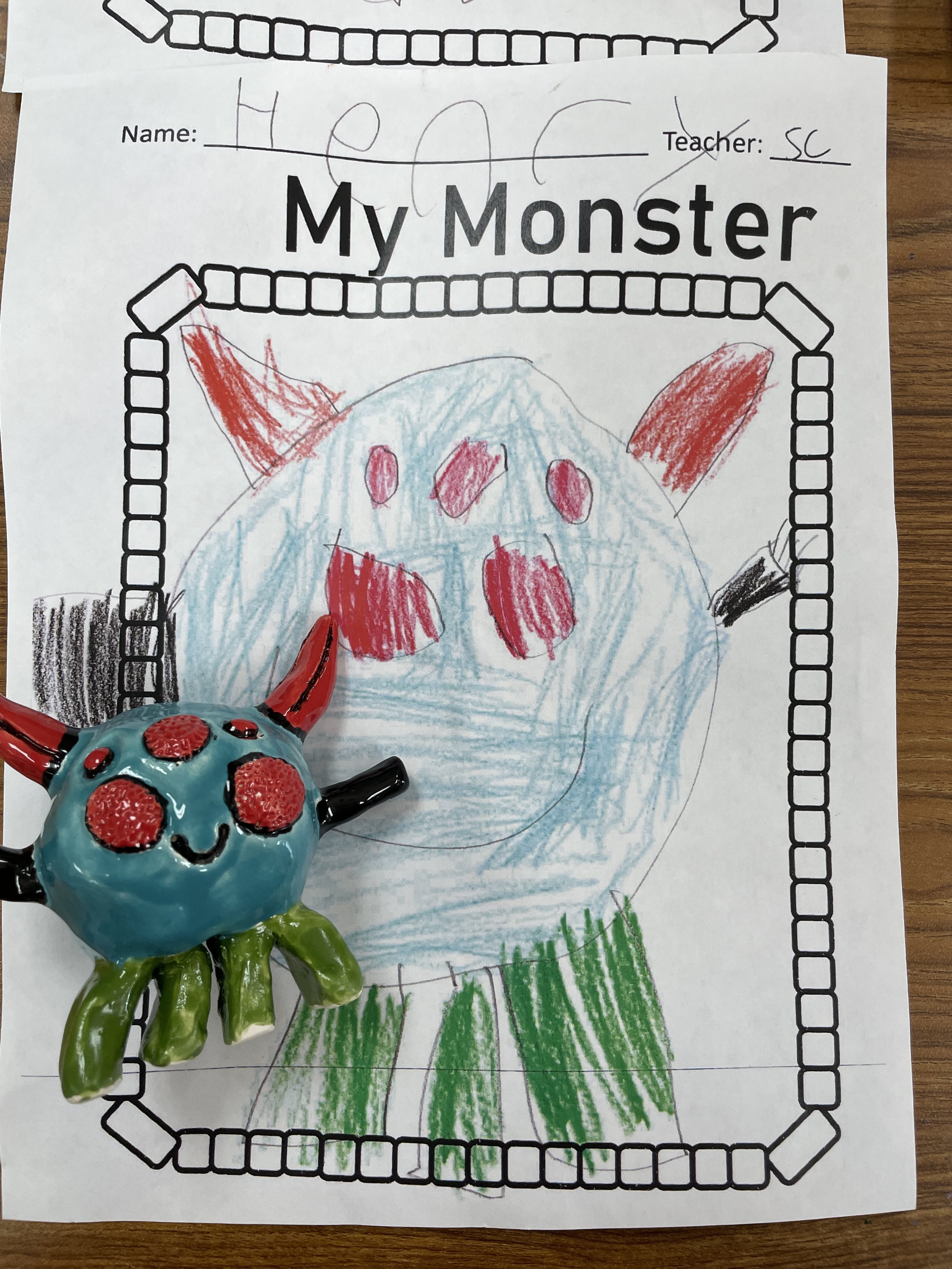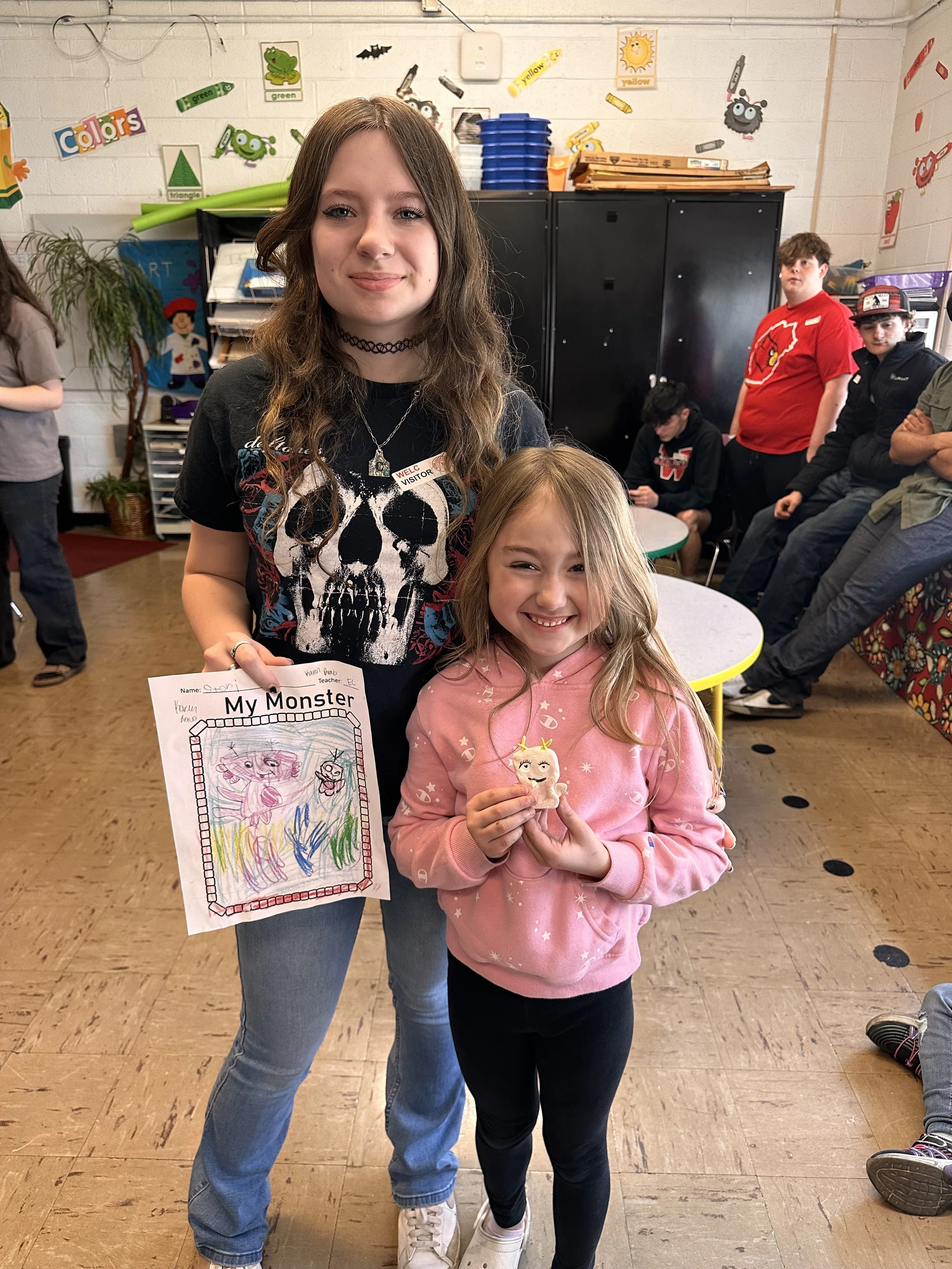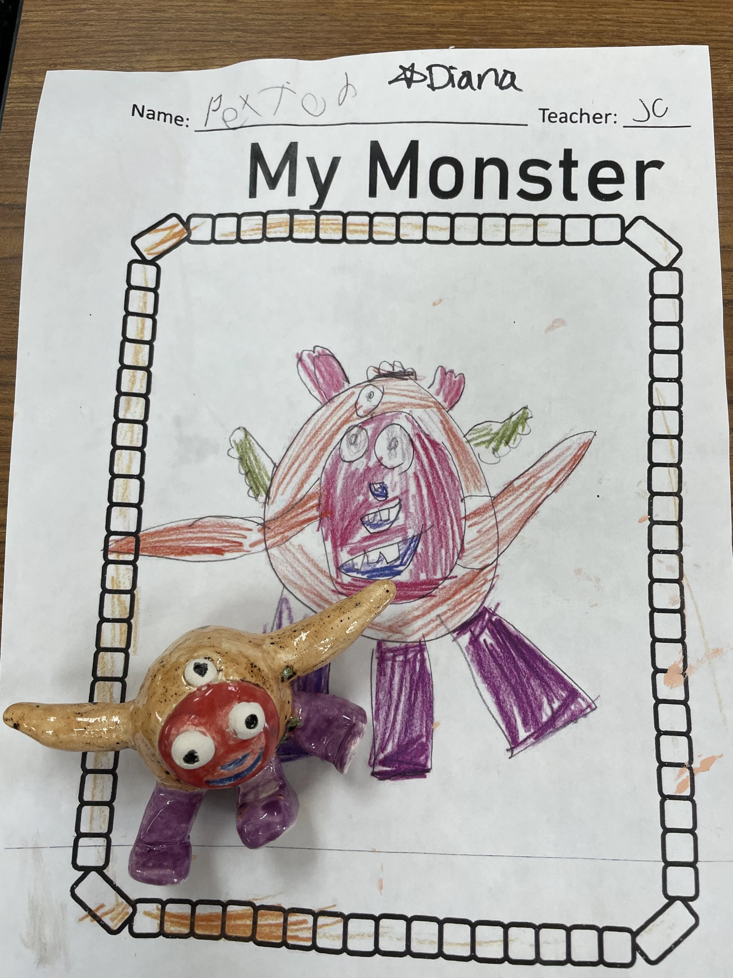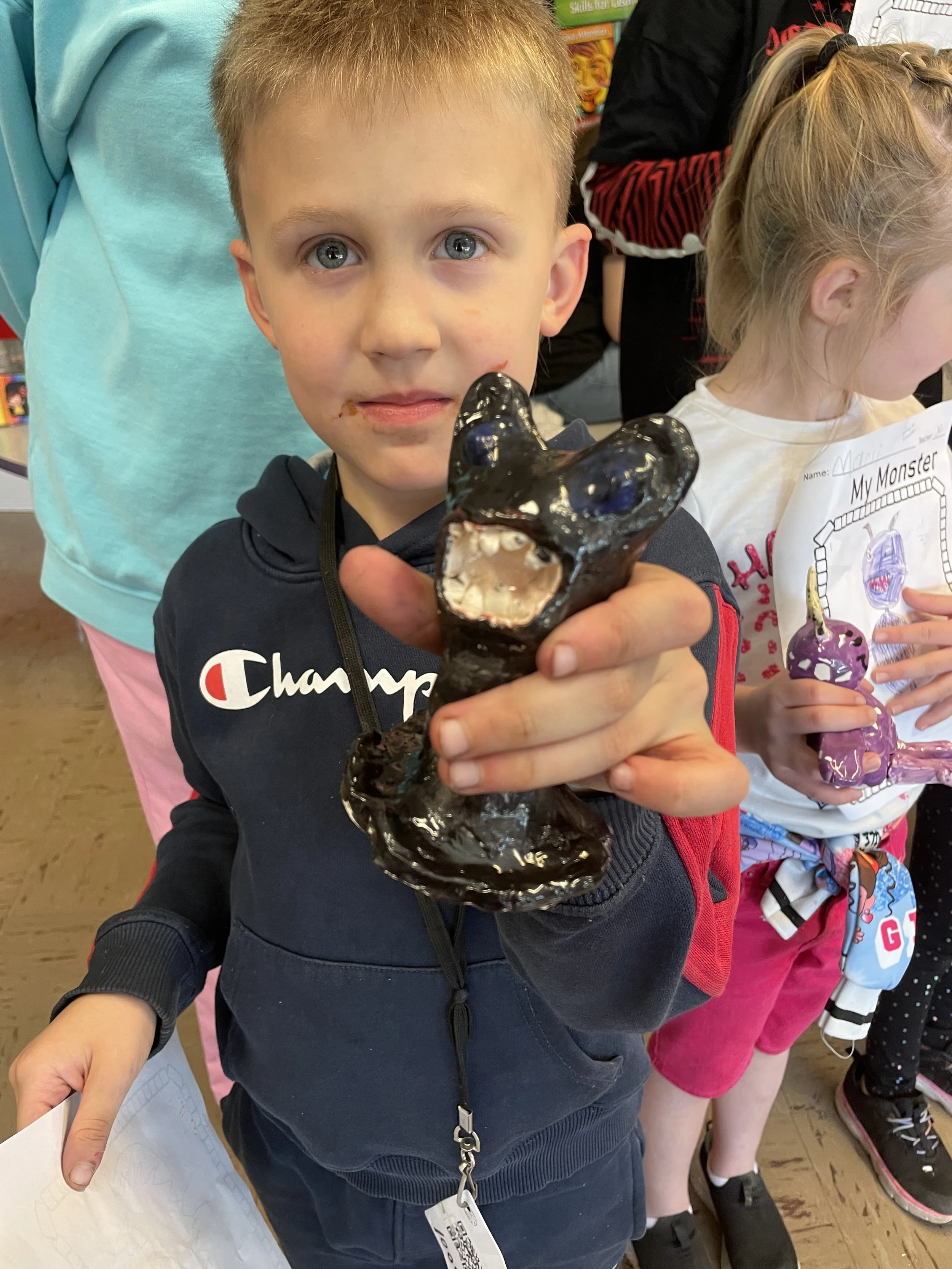 "Ceramic Monster Pals.” These were designed by Kindergarteners at Walker Early Learning Center and created with clay by the Junior Arts Council. Once Finished, the high schoolers gifted the Kindergarteners with their very own monsters that they designed previously.