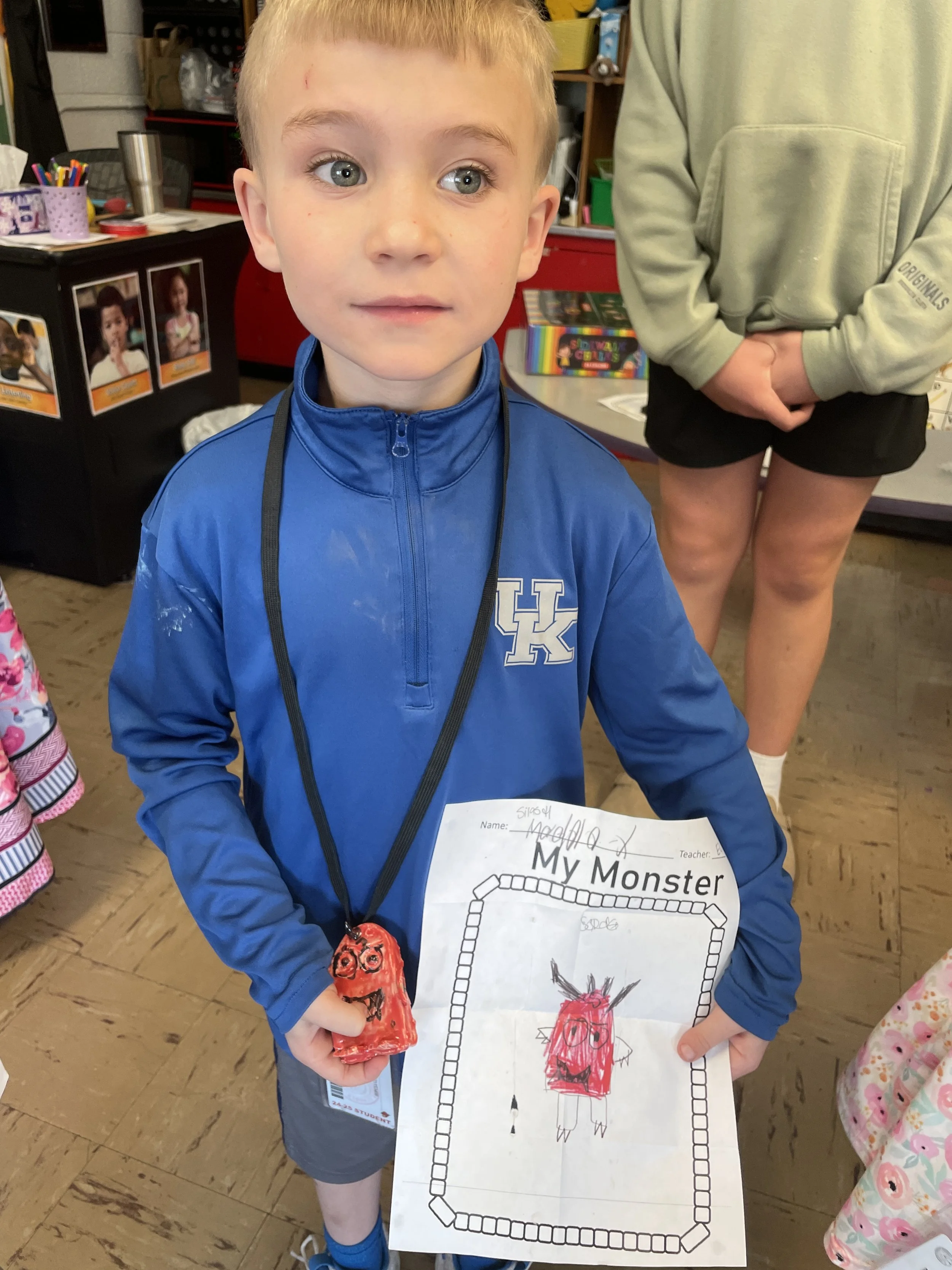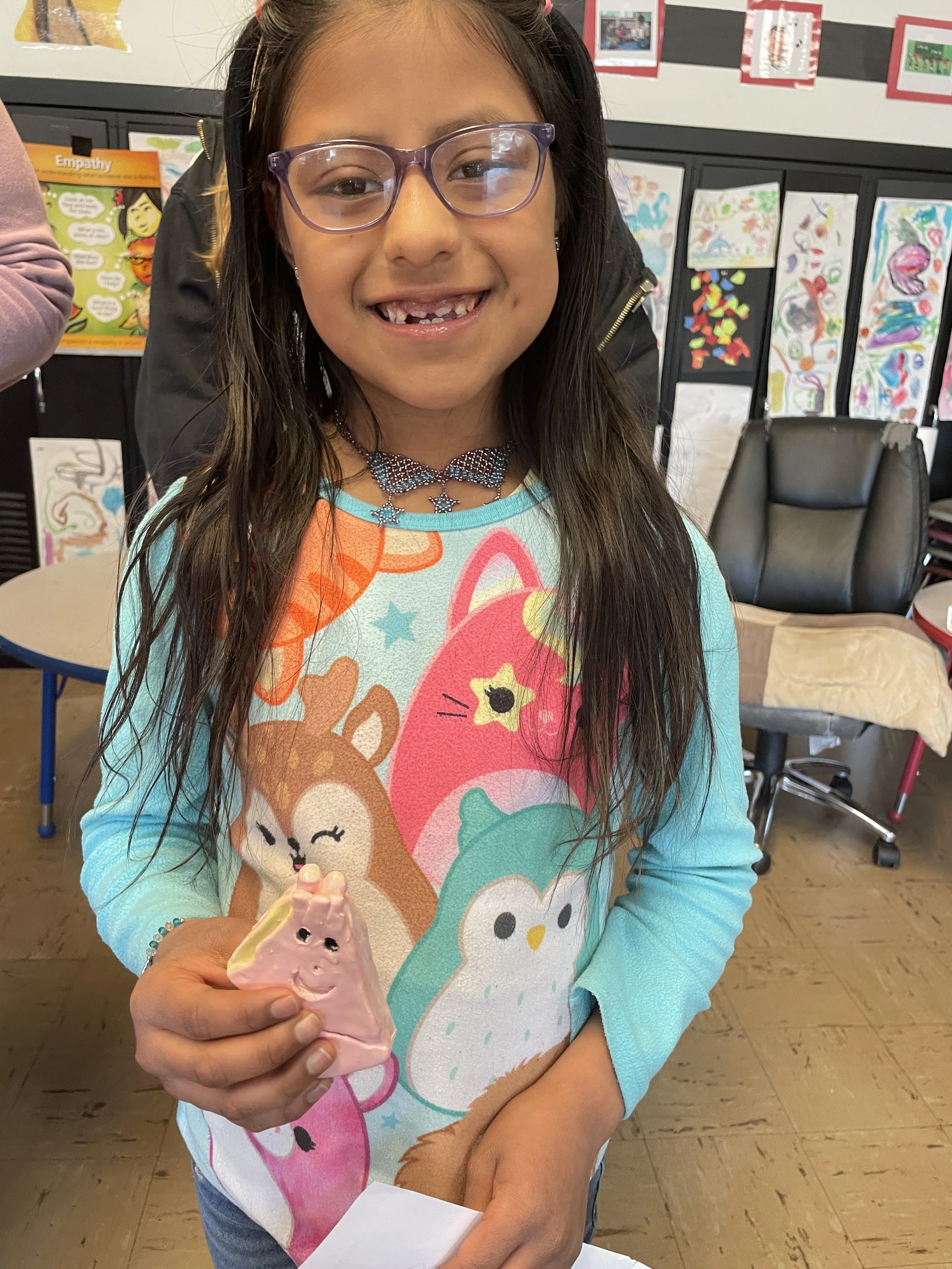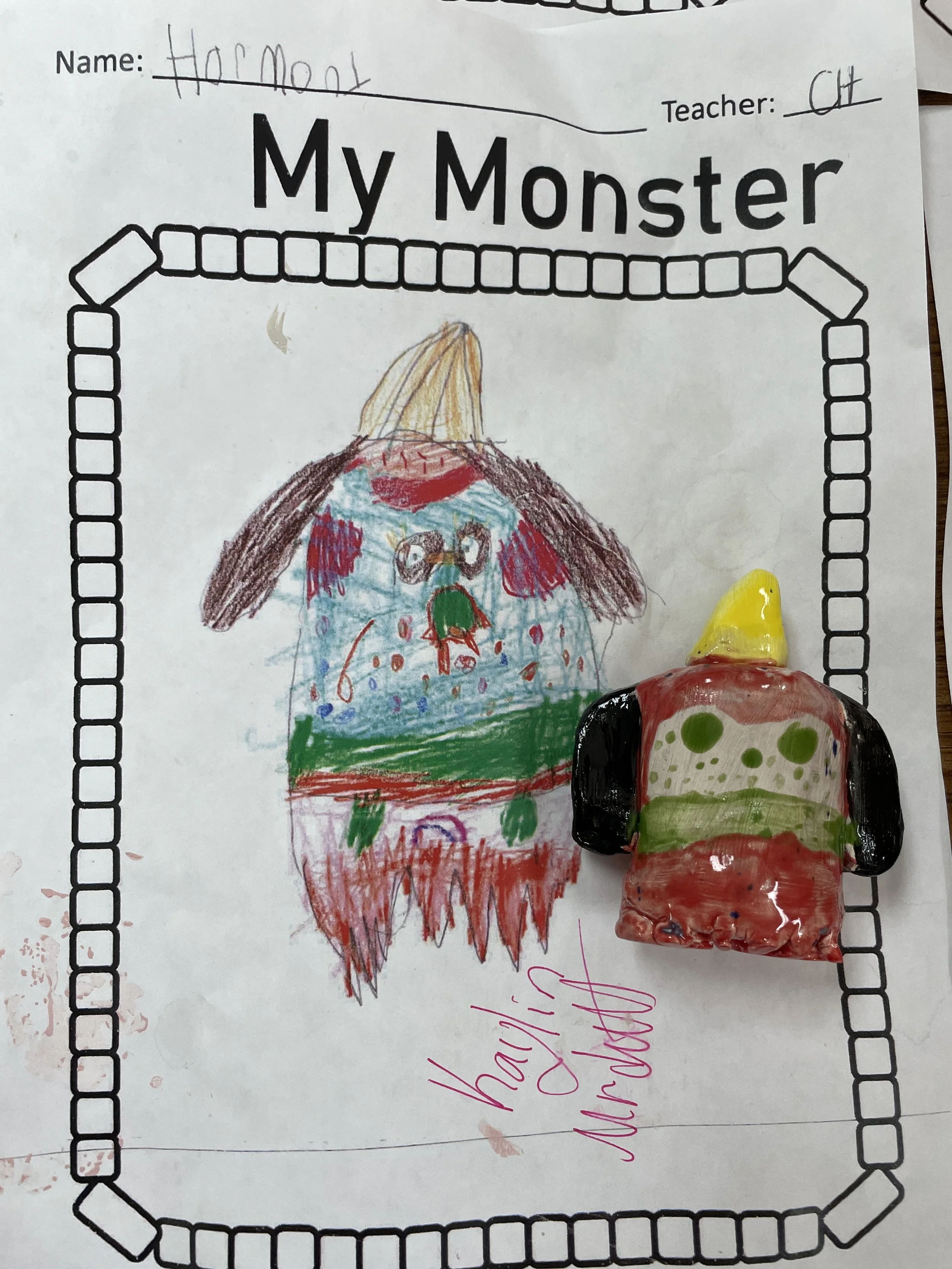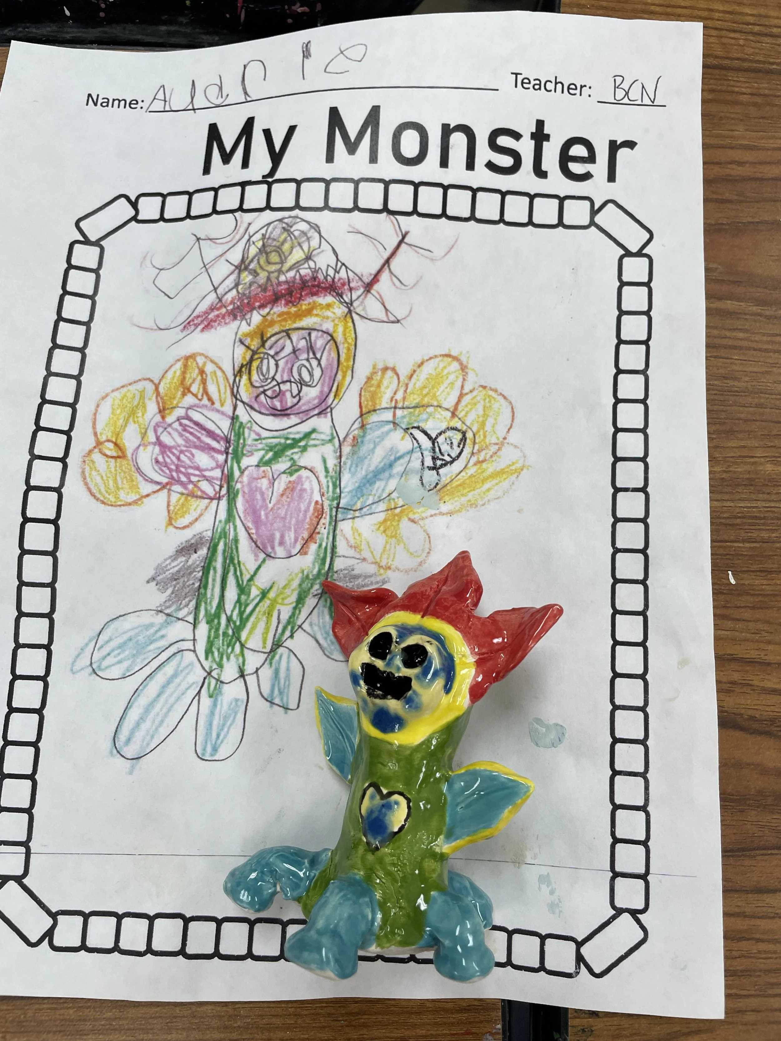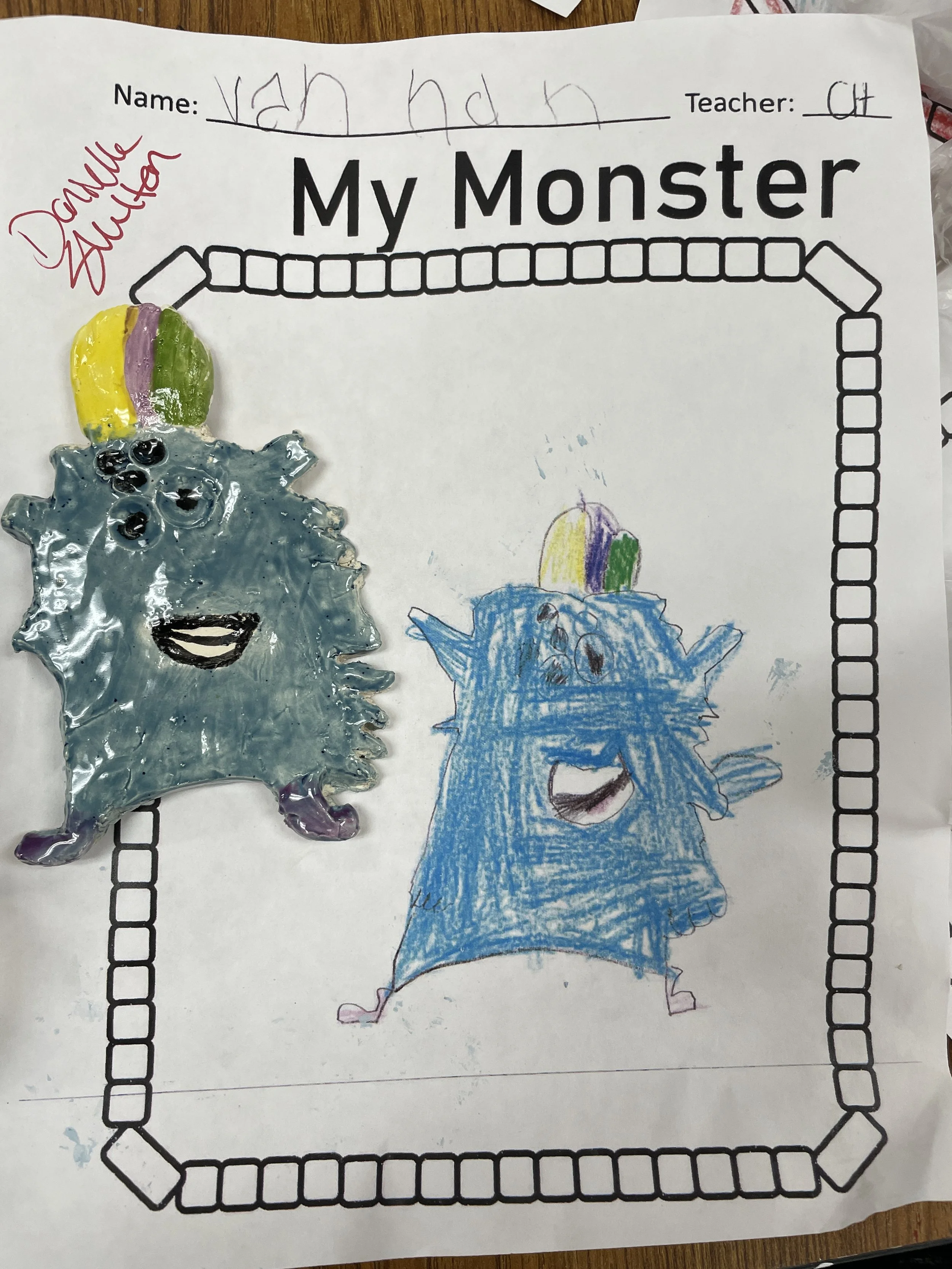 "Ceramic Monster Pals.” These were designed by Kindergarteners at Walker Early Learning Center and created with clay by the Junior Arts Council. Once Finished, the high schoolers gifted the Kindergarteners with their very own monsters that they designed previously.