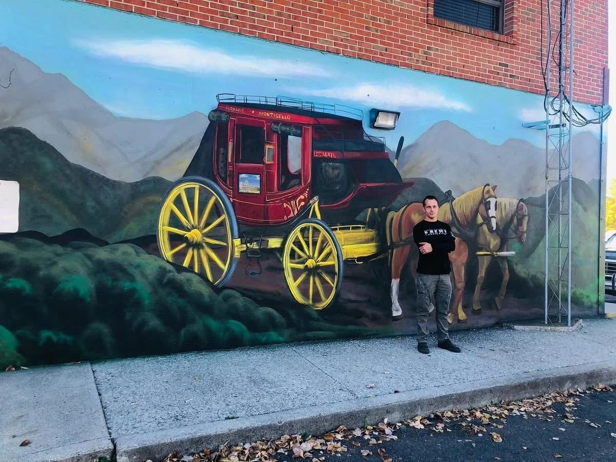 “The Stage Coach”, painted on City Hall by artist Jordan Justice